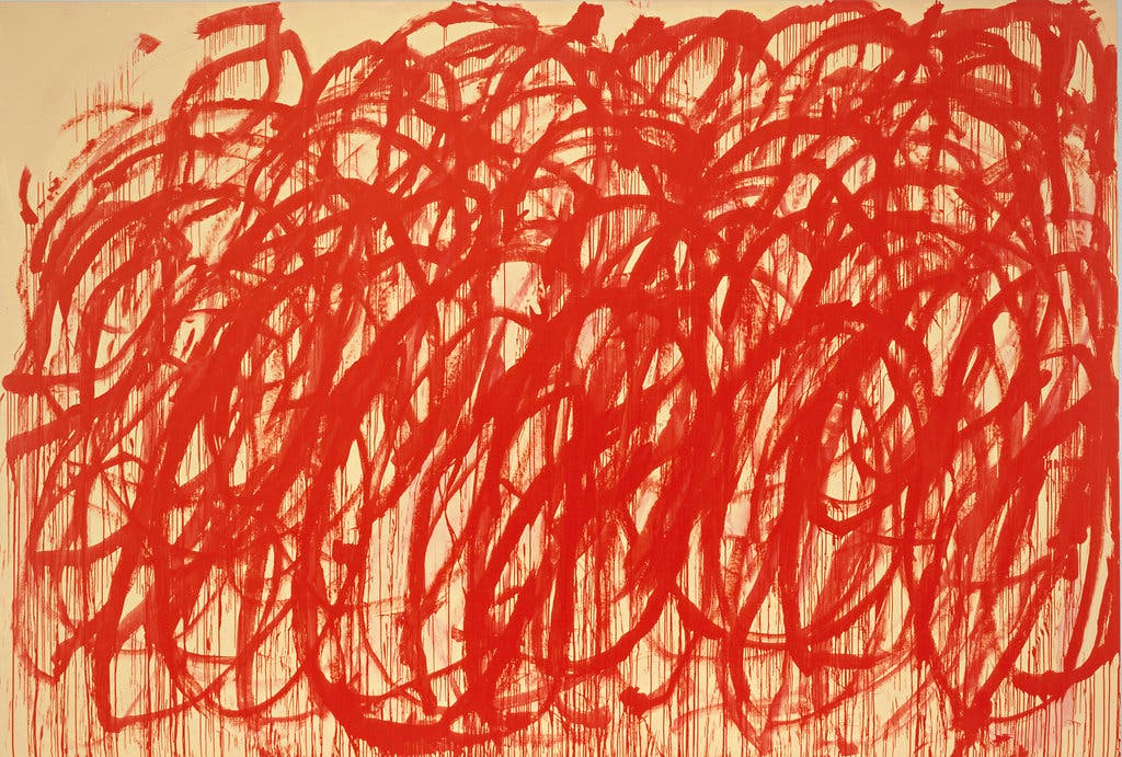 خطوط ناخوانا در نقاشیهای آبسترهی "تومبلی" با رنگ و روغن و مداد و پاستل و رنگهای محدود کار شدهاند.