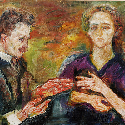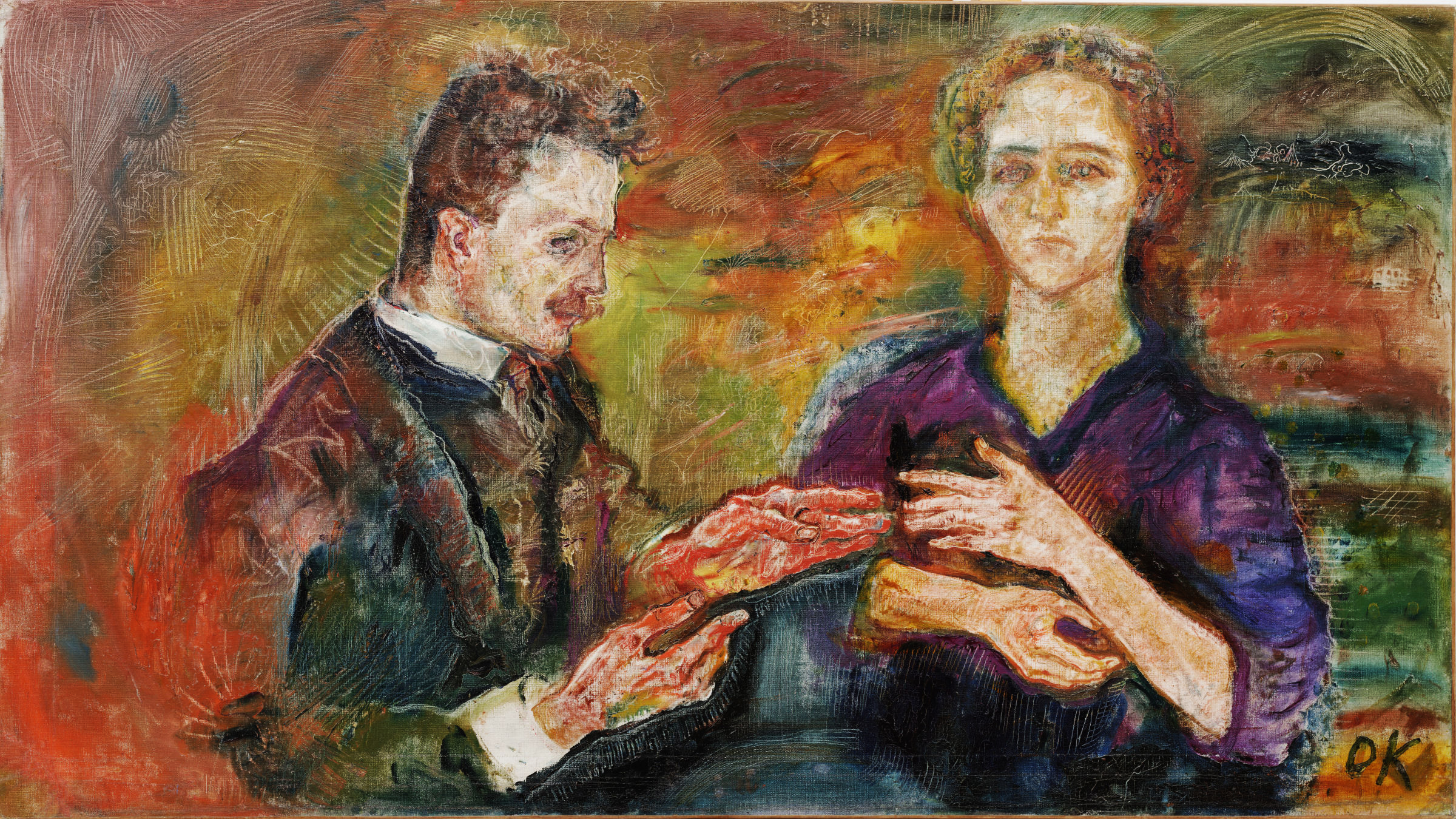 کوکوشکا از هنرمندان برجسته اکسپرسیونیسم است که در ترسیم چهره ها سعی در نشان دادن شخصیت و حساسیت درونی آدمها دارد و این موضوع بیشتر متاثر از شخصیت حساس خود اوست. در این تابلو پیکرها در پسزمینه آزاد کار شدهاند و حرکت ظریف دست های هانس و همسرش اریکا بیانگر حالت روحی این دو و حساسیت نهفته در پسِ چهره متفکرآن هاست.