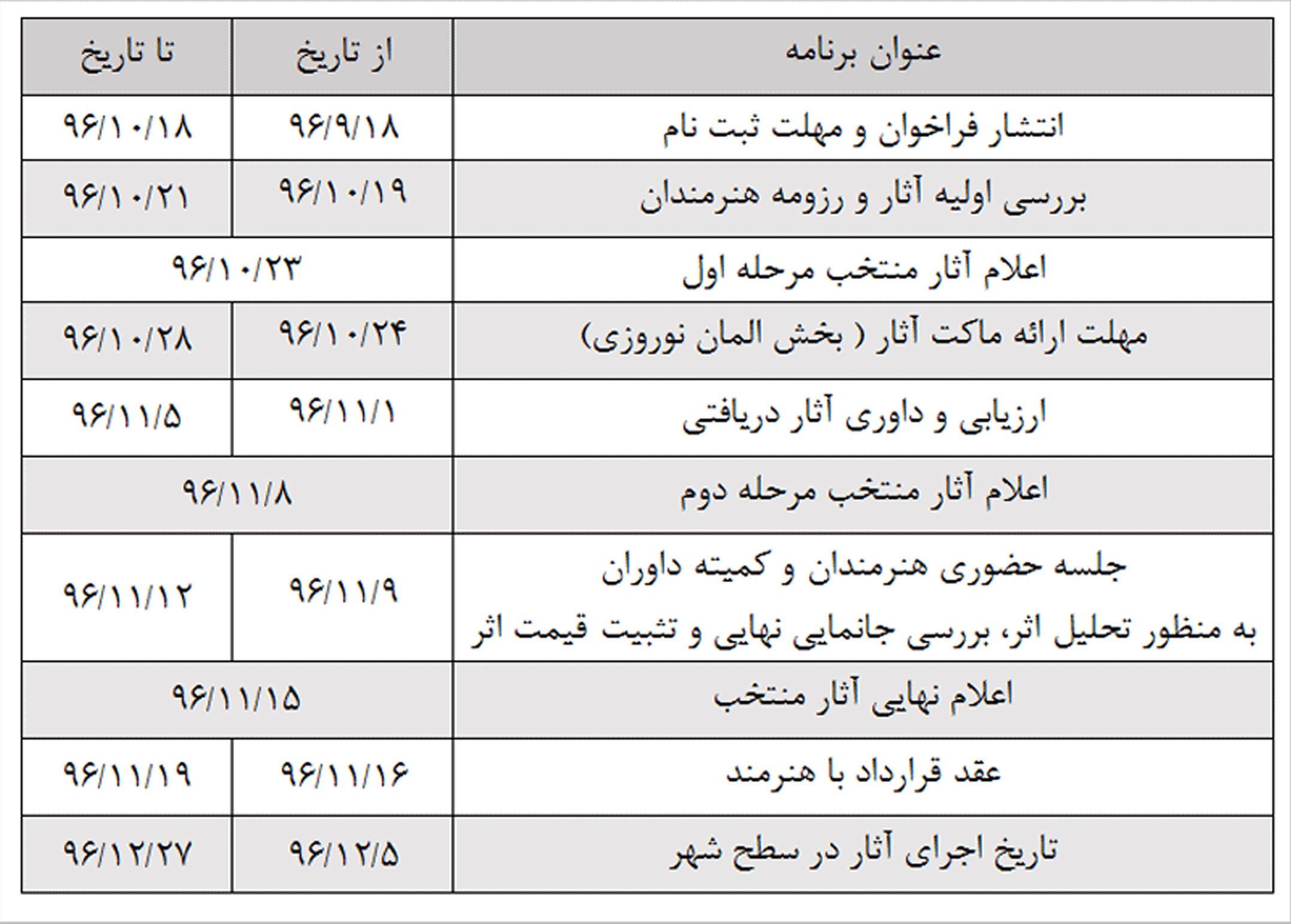 - زمان برگزاری بخشهای مختلف جشنواره، در بازههای زمانی مشخص خواهد بود که متعاقبا اعلام خواهد شد و ضروری است هنرمندان برگزیده برای اجرای آثار در شهر، تابع مقررات دبیرخانه جشنواره باشند.