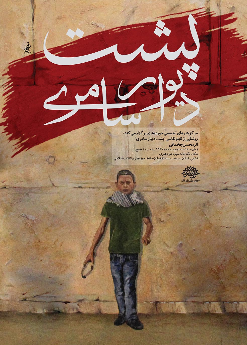به گزارش روابط عمومی مرکز تجسمی حوزه هنری ، نقاشی «پشت دیوار سامری» اثری از محسن چخماقی در حمایت از مقاومت مردم سرزمینهای اشغالی فلسطین، قبل از ظهر روز دوم مردادماه، طی مراسمی در نگاه خانه مرکز تجسمی حوزه هنری رونمایی خواهد شد.