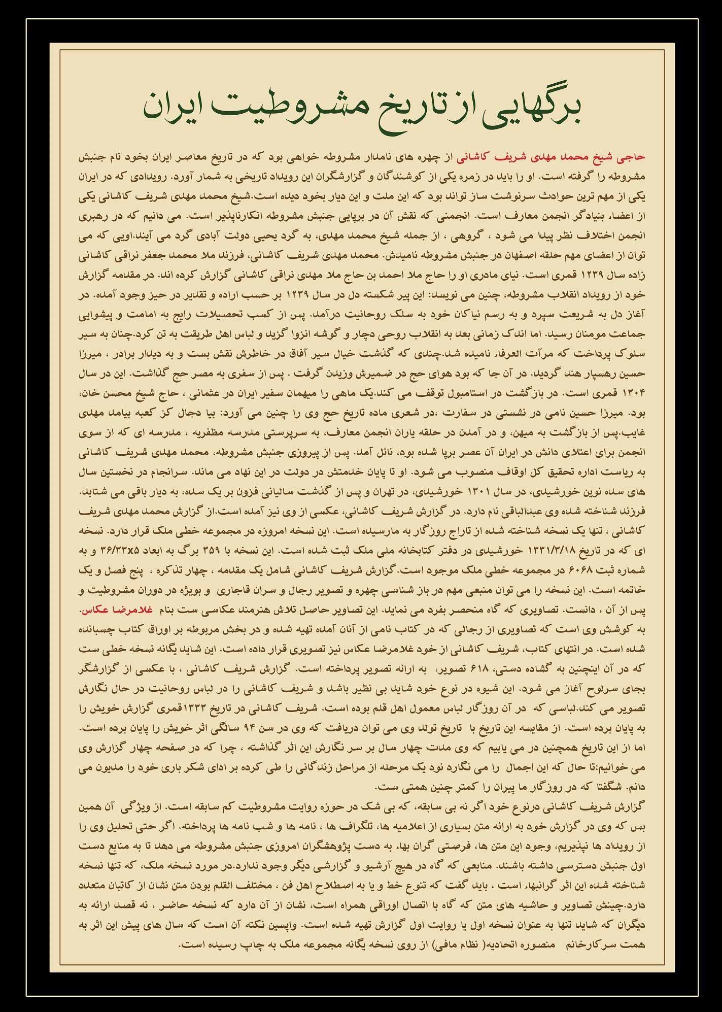 نمایشگاه «برگهایی از تاریخ مشروطیت ایران» برگرفته از تصاویری از نسخه خطی کتاب «واقعات اتفاقیه در روزگار» نوشته محمدمهدی شریف کاشانی است که در گنجینه نسخههای خطی کتابخانه و موزه ملی ملک نگهداری میشود. این سند ارزشمند تاریخی، بیش از 600 قطعه عکس تاریخی و دست اول از رخدادهای جنبش مشروطیت ایران را در کنار روایتهای تاریخی دربرگرفته است. این نمایشگاه در قالب 26 تابلو از این نسخه خطی با هدف نمایش گوشههایی از تاریخ معاصر ایران و بازشناسی گنجینه نسخههای خطی و آثار تاریخی نخستین موزه وقفی- خصوصی ایران برپا شده است. محمدمهدی شریف کاشانی، نسخه خطی «واقعات اتفاقیه در روزگار» را در 359 برگ کتابت کرده و نگاشته است. این نسخه ارزشمند که یک مقدمه، چهار تذکره، پنج فصل و یک خاتمه دربردارد، همچنین منبعی مهم در بازشناسی چهره و تصویر رجال و سران قاجاری به ویژه در دوران مشروطیت و پس از آن است. عکاسی به نام غلامرضا همراه شریف کاشانی بوده که 618 تصویر دست اول از رخدادها و شخصیتهای درگیر جنبش گرفته و نویسنده آنها را در هر بخش از کتاب چسبانده است. اعلامیهها، نامهها، شبنامهها و تلگرافها در این کتاب خطی نیز نماهایی دیگر از تاریخ مشروطیت را به نمایش گذاشته است.