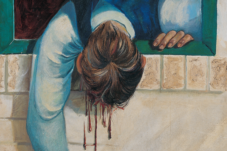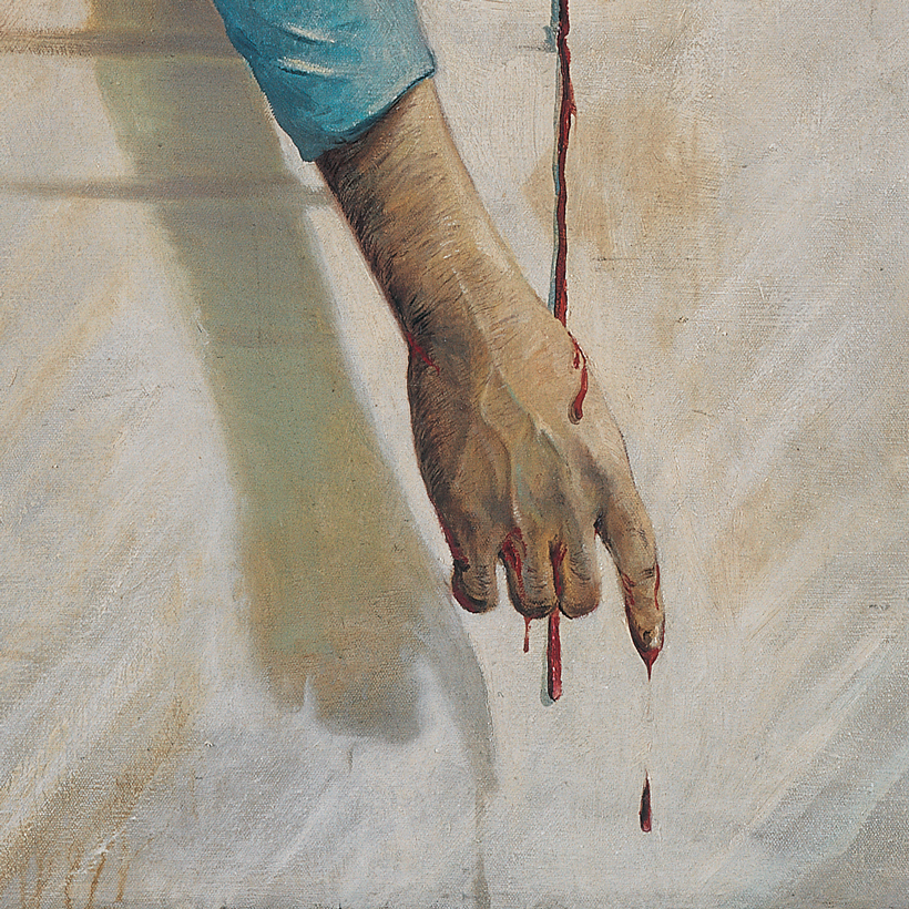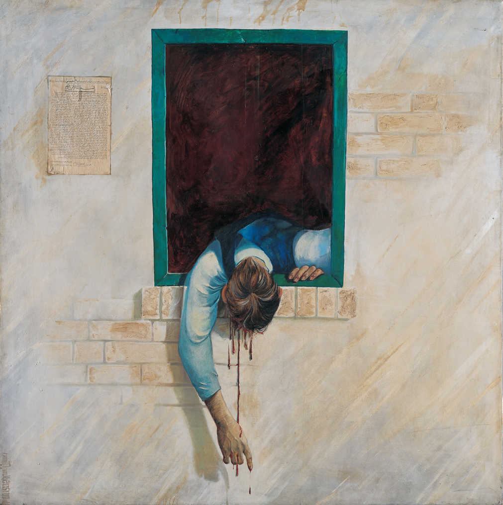 در مرکز این تابلوی مربع شکل، تصویر مردی دیده می شود که به شهادت رسیده، سرش به سمت جلو خم شده و خون از سر و دستانش می چکد. لباسی که بر تن دارد ممکن است لباس مخصوص کارگران باشد. در سمت چپ اثر، اعلامیه ای بر دیوار چسبانده شده است، این اعلامیه مربوط به چهلم شهدای تهران است.