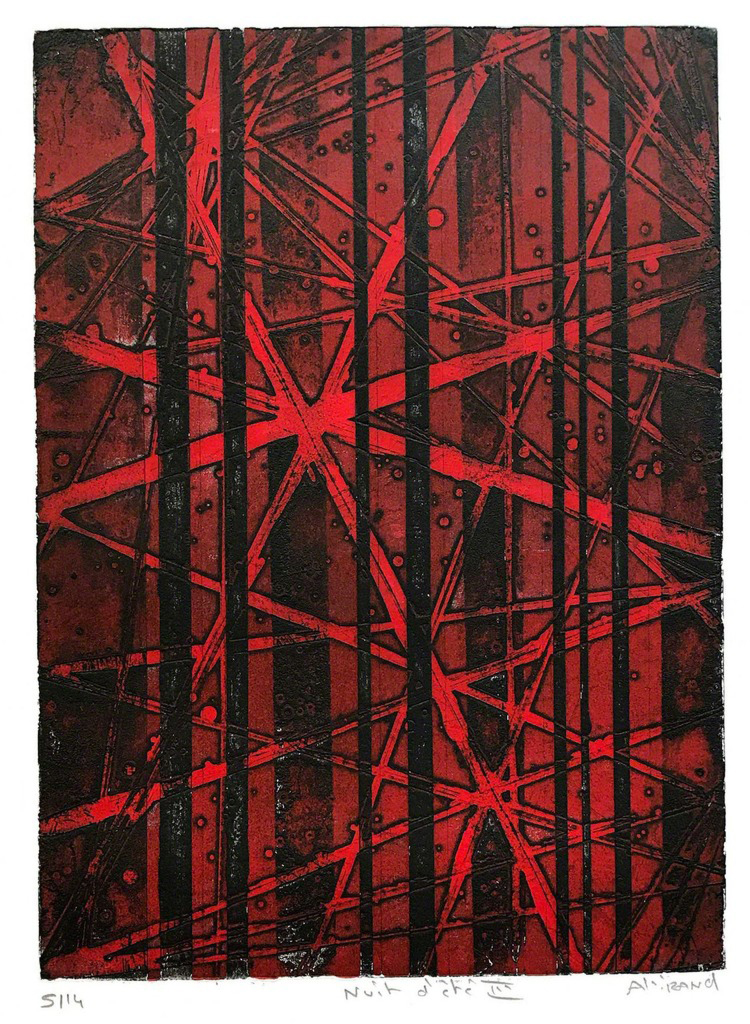 نود آلیراند، تمرکز بر استفاده از قلمموی نازک که در اسید هیدروکلریک فرو می رود، دارد. قلم مو، صفحه را نوازش می کند، آن را میسوزاند و بعد از رنگ آمیزی و چاپ از طریق فشار خطوط نامنظم و تقریبا نامرئی را نشان می دهد، یک سایه تک رنگ نرم در خاکستری شفاف. او گواش، جوهر هند و اکریلیک را مخلوط می کند. کارهای وی در مجموعههای عمومی و خصوصی در سراسر ایالات متحده و اروپا وجود دارد.