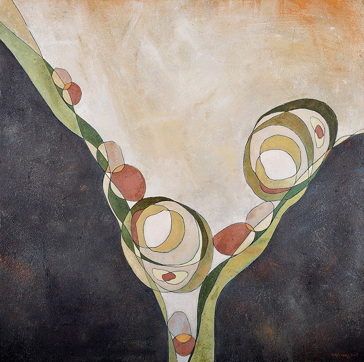 اکنون در نخستین نگاه به مجموعه مغاک، با عناصری عینی، ملموس و آشنا، مانند سنگها و درهها روبهرو هستیم. سنگها، با حرکاتی مواج و لغزان و روان به سوی بالا و پایین در دل مغاکی تیره جریان دارند، اما این تمام ماجرا نیست؛ در آثار هوشنگ، سنگها، درهها و صورت کلی فضا و خطوط با ظاهری ساده، اما درهم پیچیده، چندلایه و نمادین، راوی قصه دیگری هستند. شکلها نمادی هستند که در هیبت سنگ جان گرفتهاند تا معنای حاصل از تجربه زیستی و نگاه هنرمند به جهان پیرامونش را روایت کنند.