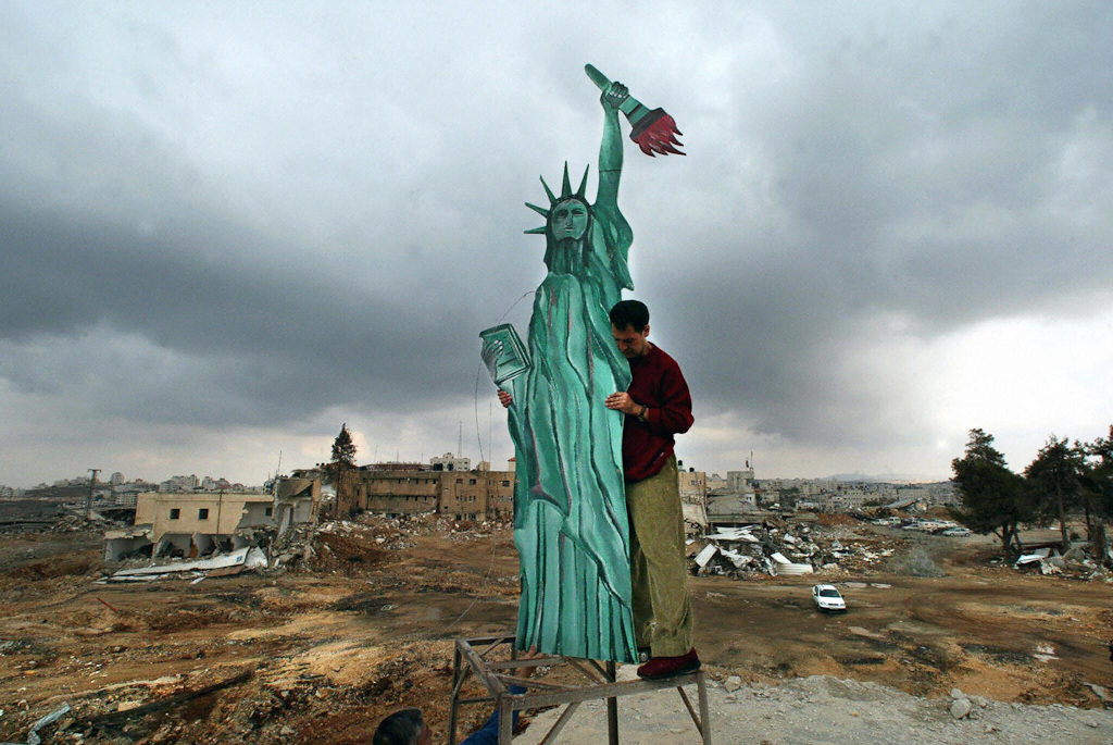 "مجسمه آزادی" که در کرانه رود باختری رام الله، روبروی مکان تخریب شده ستاد یاسر عرفات نصب شده است