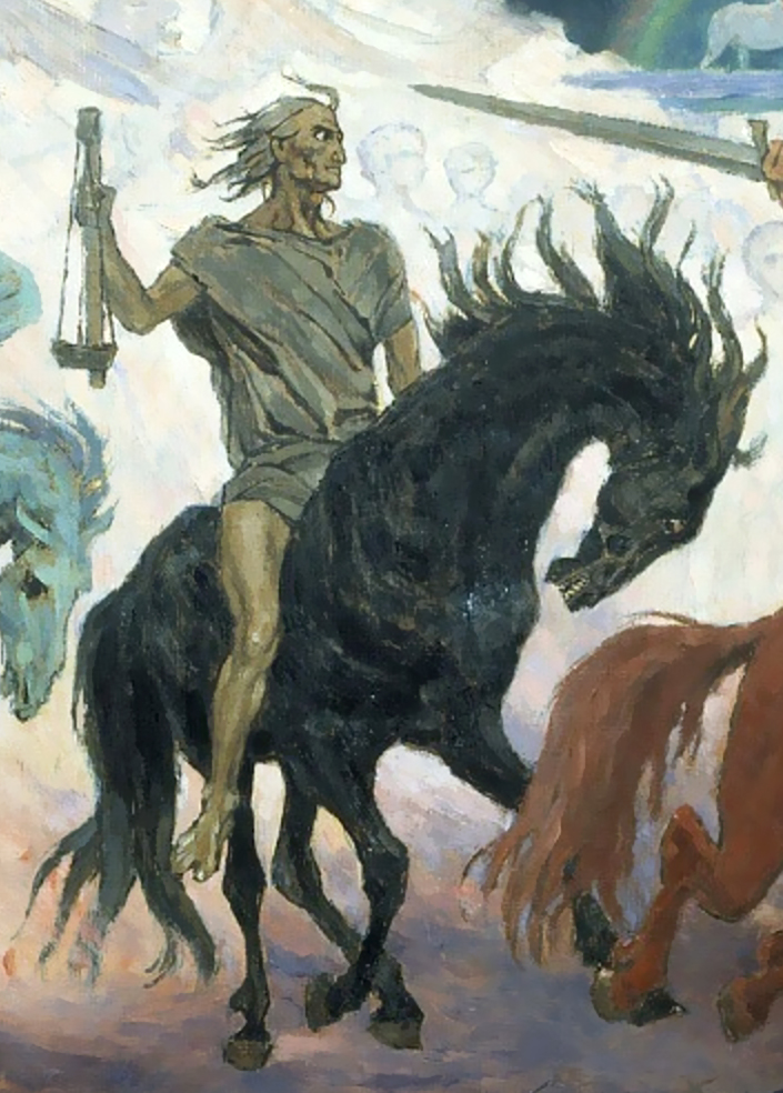 سوار سوم که بر روی اسب وحشی می‌رود، گرسنگی را نشان می‌دهد؛ او به رنگ خاکستری نشان داده شده است با میزان و ترازویی در دستانش. پیکر این سوار لاغر است، صورتش بی روح است مانند استخوان‌های پوشیده شده با پوست. لیبرا یا میزان نماد و سمبلی است از عدالت نادرست.