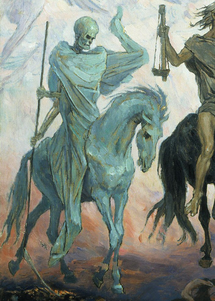 نام آخرین سوارکار مرگ نام دارد و اسب رنگ و رو پریده. سواری که بر روی آن نشسته به جای سر یک جمجه دارد و بافتی در دست. این رنگ یک سبز کم‌رنگ غیرطبیعی است. این نماد جهنم است.