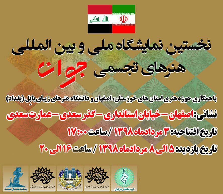 به گزارش روابط عمومی حوزه هنری استان اصفهان، این نمایشگاه باهمکاری حوزه هنری استان خوزستان و حوزه هنری اصفهان، دانشگاه هنرهای زیبای بابل بغداد، از3 مردادماه لغایت 8 مردادماه در گالری شماره یک سعدی اصفهان واقع در خیابان استانداری، گذرسعدی، ساختمان سعدی برگزار خواهد شد.