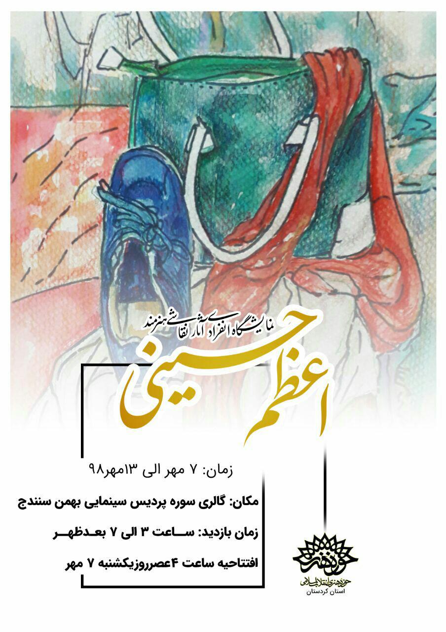 نخستین نمایشگاه انفرادی هنرمند جوان سنندجی اعظم حسینی با حمایت حوزه هنری انقلاب اسلامی استان کردستان از۷ لغایت ۱۳ مهرماه ۹۸ در سنندج برپا می گردد .