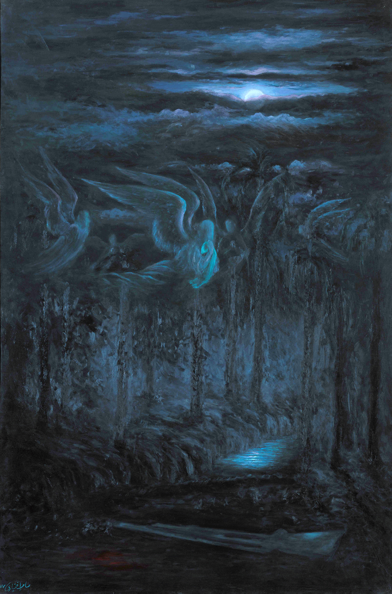 رویایی در جریان است . در لحظه ای زمان متوقف می شود و همه چیز رنگ و بوی متفاوت می گیرد . نوری تمام تابلو را فرا گرفته که از خورشیدی روشن تر بالای تابلو سرمنشاء میگیرد . اما نمی دانیم واقعا روز است ؟! همین بازی هوش مندانه نقاش با رنگها ما را در ابهام فرو می برد که گویی زمان خاصیت این جهانی ندارد .